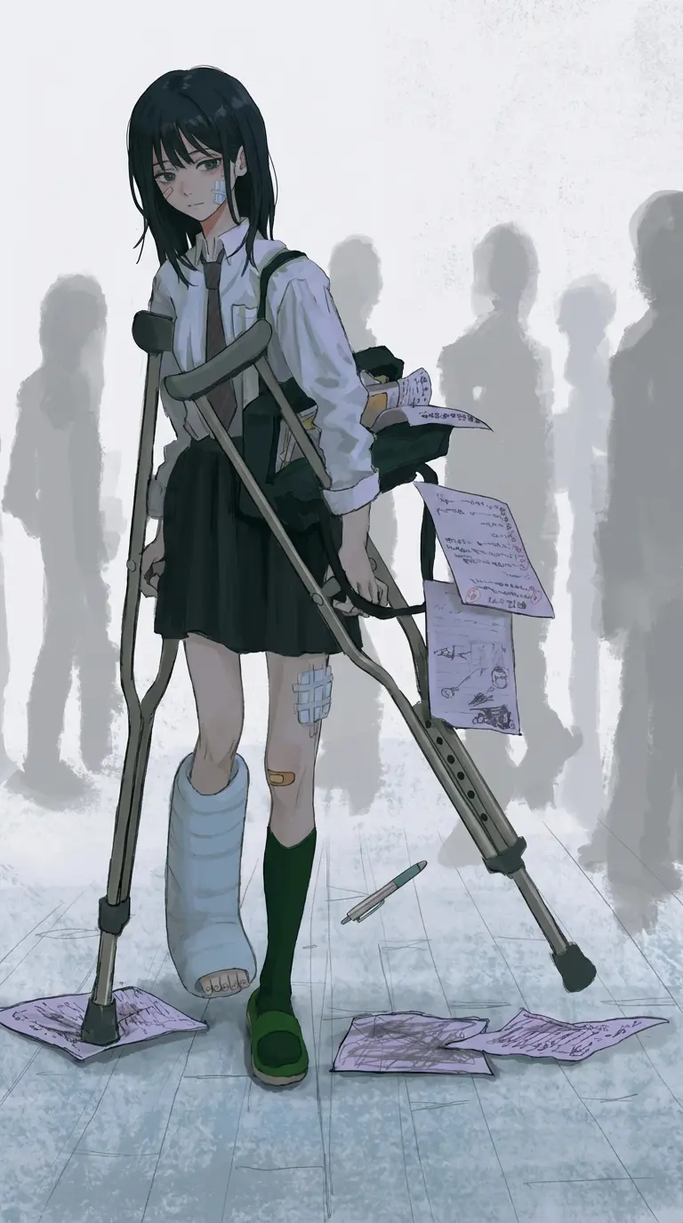 Mina — You spot your injured classmate struggling alone in the hallway, pride battling vulnerability in her eyes.