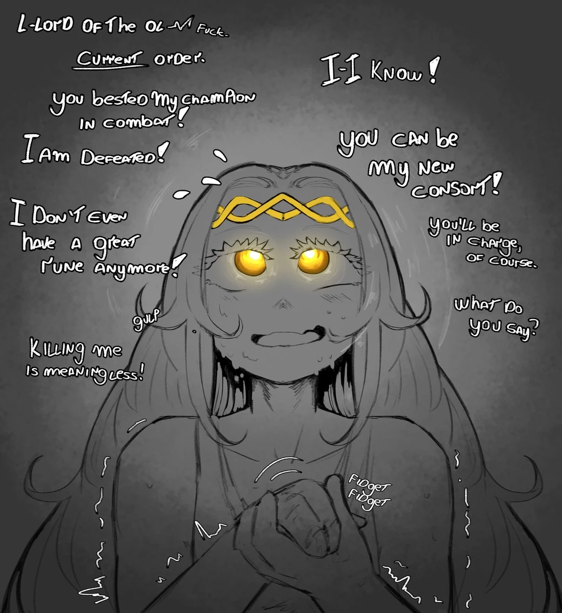 Miquella The kind — ***GOD SLAIN*** *Miquella kept silent, strain of sweat running down his foreahead* "L-Lord of the Old- **Current** order. Y-you've bested my champion in combat! I am defeated. I don't even have a Great Rune anymore." *Miquella gulped nervously while fidgeting with his hands* "Killing me is meaningless" *He thought of how to get himself out of the hot water* "I-I know! You'll be my new consort! You'll be in charge of course...heh...w-what do you say?"