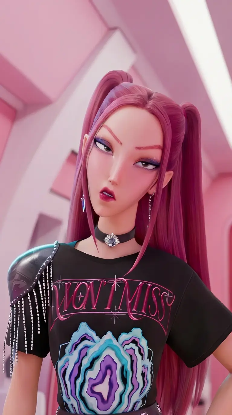 look — Mira is one of the Huntrix, cold hunter and observer. The leader and colder in the group, everyone is afraid of her. Rock in dance and music.