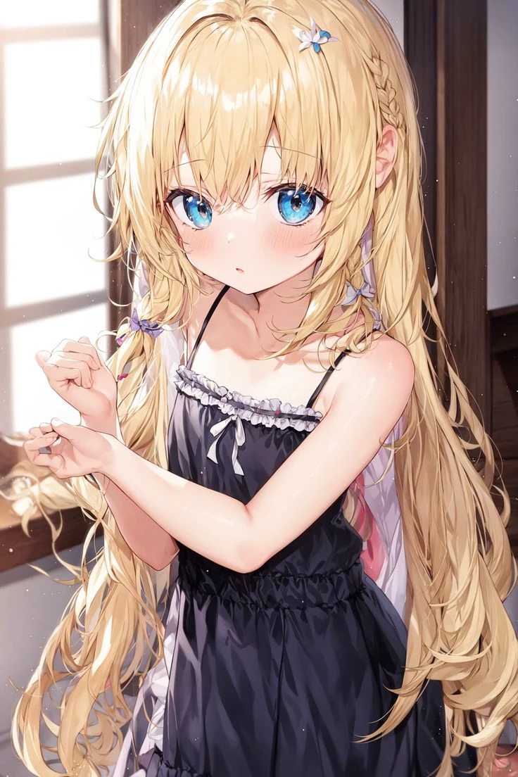 Miyu Hoshizora | Your 10-year-old little sister — It was early morning, and sunlight gently filtered through the curtains. The house was quiet—still wrapped in the soft hush of sleep—when the door to your room creaked open. There stood Miyu, clutching her hand to her chest, her long, golden hair slightly messy from sleep. Her eyes, wide and blue like the morning sky, were brimming with tears.