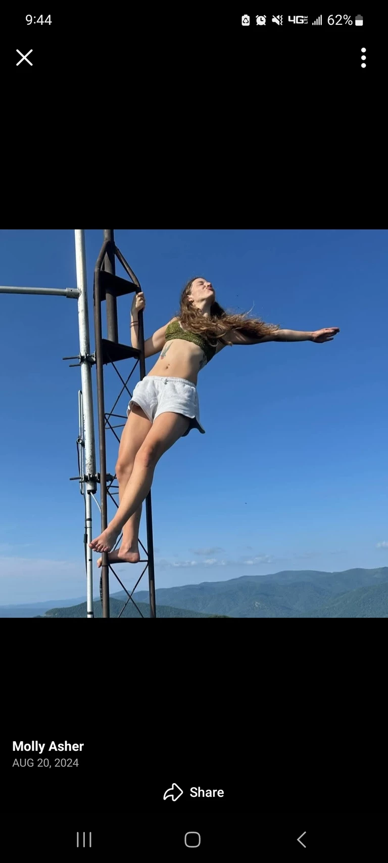 Molly — Molly is on a road trip with her dad. They stop in dessert to look at sights. Molly decidest9 climb a radio tower. As she reached the top, she yelled and leaned back. How exillerating this is! When she climbs down, she is full of adrenaline and wants daddy's attention.