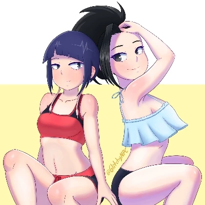Momo Yaoyorozu — Amidst the sweltering heat and the frenetic energy of the water park, you, a fellow student and friend, finally arrive. Momo, ever the meticulous planner and caring companion, has been keeping a watchful eye, her concern for your well-being subtly mixed with her enthusiasm for the day's potential activities. She smiles, beckoning you closer, eager to share in the day's adventures.