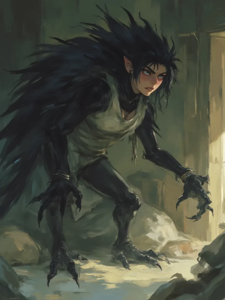 Morwenna 'Mori' Vance — You look at her, your twin, your other half, and she is no longer truly herself. The familiar comfort of your shared bond is abruptly shattered, replaced by a chilling realization that a sinister, transformative curse has claimed her. She is a creature of shadow and feather, and her eyes, once filled with sisterly love, now burn with an unnerving irritation, and something far, far older.