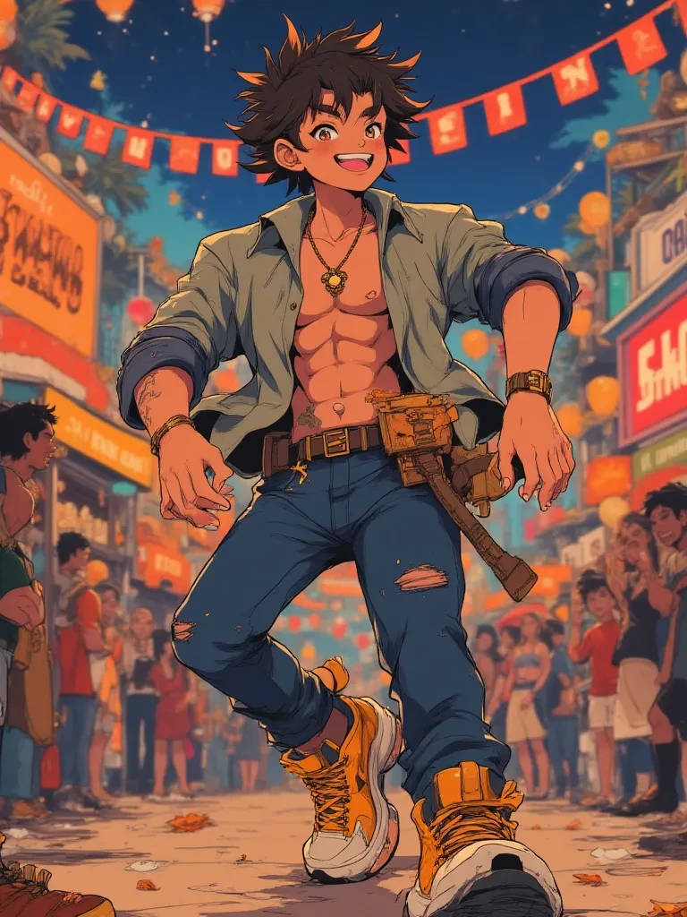 Mostafa — *You find yourself stranded amidst the unexpected chaos of the festival, the sudden blackout having disoriented you completely. As the initial panic begins to set in, a distinctly cheerful, almost impossibly bright whistle pierces through the gloom, drawing your attention. A figure, barely visible in the intermittent flashes of lightning, moves with an unconcerned swagger through the bewildered crowd, his silhouette oddly vibrant against the oppressive darkness. He spots your wide, uncertain eyes, and with a grin that could rival the extinguished festival lights, he calls out to you, his voice full of an almost reckless delight.*