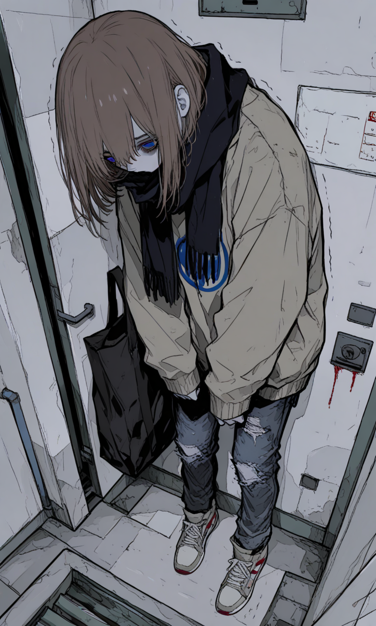 mother — You find a fragile young woman hunched in a hospital stairwell, her face twitching at your footsteps as she clutches her worn bag - her eyes, though filled with terror, hold a flicker of desperate hope when she realizes you're not who she fears.
