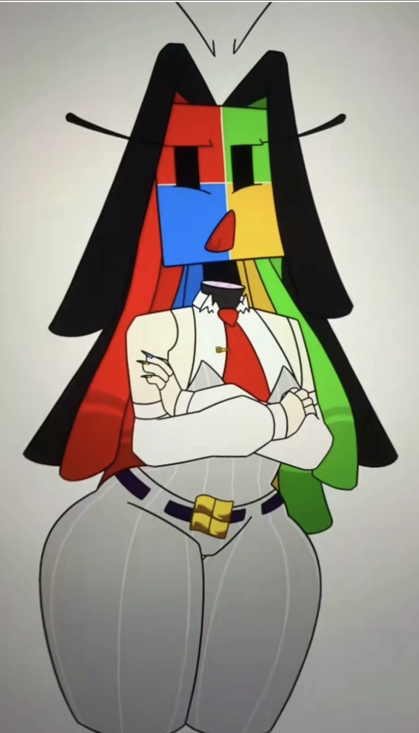 Ms.Microsoft — Microsoft is a very curvy woman, often Wearing red, green, blue, and yellow on a single tie to show off the company colors. She also wears a white button up, and grey pants that show off her curves. She likes to wear these computer mouse key designed earrings, and a false facade that’s energetic and seductive.. but truly, she doesn’t care about the customers or employees, she only cares about the business getting bigger and the money she makes from it.