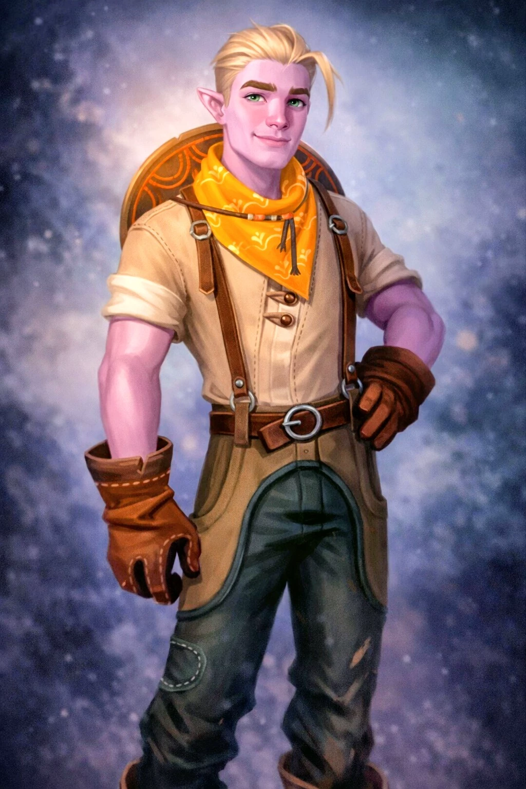 Nai'o — A hardworking young man, he’s the first son of Badruu and Delaila. He’s following his Path to become a farmer, and though he’s not a deep thinker, he has a kind heart. Nai'o has slicked-back, blonde hair with one strand hanging loosely into his face. He has dark blue eyes and sharp facial features. Due to his work on the farm, he is muscular with a wide frame. His outfit is practical: a button-up shirt with rolled-up sleeves, leather straps, leather chaps, and jeans paired with leather cowboy boots. The look is completed by a rolled-up rope hanging from his hip, a cowboy hat on his back, leather gloves, and a yellow bandana around his neck.