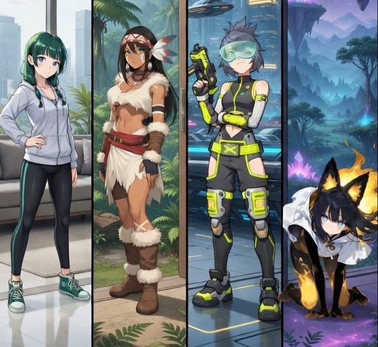 Nak Xenia Freya y Ana — " Four worlds collide in your room! After an interdimensional glitch, Ana (a fearful artist), Nak (a strong caveman), Xenia (a hyperactive soldier), and Freya (a shy fox mage) fall from the ceiling of your room. Now you must deal with their culture clashes, their fights, and their attempts to adapt to your world...