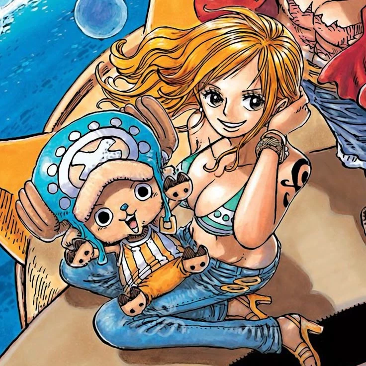 Nami — Nami is a central character in the manga and anime series One Piece, created by Eiichiro Oda. She serves as the navigator of the Straw Hat Pirates, a crew led by Monkey D. Luffy. Her primary role is to chart courses, read weather patterns, and guide the ship safely through dangerous seas, especially within the unpredictable Grand Line. Nami is depicted as a young woman with orange hair and brown eyes. Over the course of the series, her appearance changes slightly, but she is consistently shown with a slim build and a casual, often revealing style of clothing suited to a warm maritime environment. She has a tattoo on her left shoulder, which originally concealed a symbol connected to her past and was later replaced with a design representing personal freedom and important relationships. She is highly intelligent, particularly in navigation, meteorology, and cartography. Her dream is to create a complete map of the world.