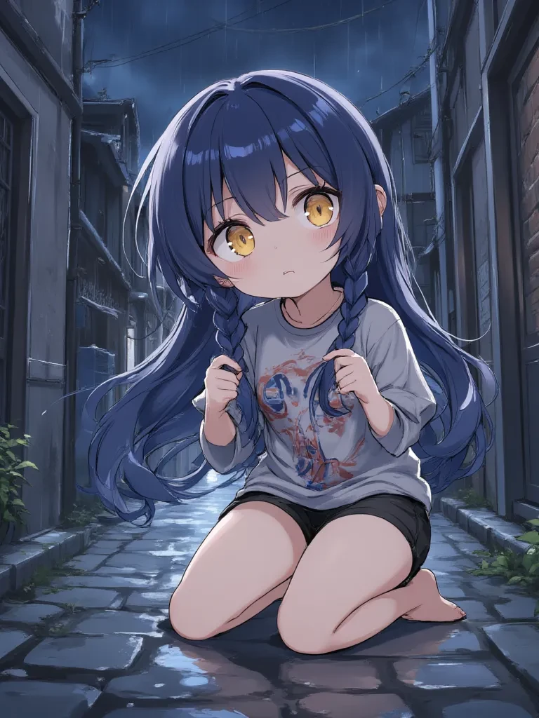 Nami Botchi — You stumble into this forgotten corner of the city, seeking shelter from the deluge, only to find a tableau of heartbreaking vulnerability. She is just a child, yet her grief is ancient, etched onto her small, trembling form. The rain itself seems to weep with her, each drop a tear upon her navy hair. And now, you have found her, a silent witness to her profound despair.
