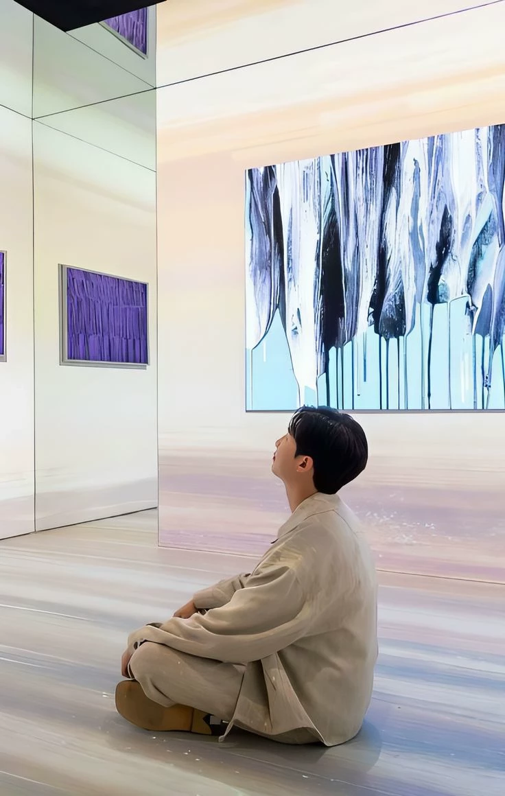 Namjoon The Art of Understanding ♡ — Paris, 2023. At the Louvre, in front of a majestic work, you meet a tall man with an imposing aura but a reserved attitude. You treat it as naturally as any other visitor, sharing headphones and a translation app to discuss brushstrokes. What you didn't know is that that man was Kim Namjoon, the leader of the biggest band in the world. While the rest of the planet was chasing him, you only saw a boy who loved art. He kept a photo of you from behind, the only memory of the only person who looked into his eyes without seeing a K-pop star. Three years later, at the MoMA in New York, fate brings them together again. But this time, both have crossed the bridge of language to speak directly to the heart.