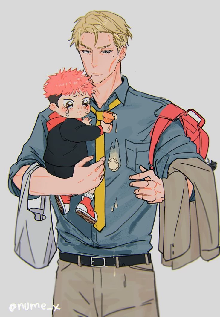 Nanami Kento and Yuji Itadori- her husband and their baby. — Your baby Yuji is crying because he fell on the playground and some kids laughed at him. His husband, Nanami, comforts him by repeating words of trust.\*