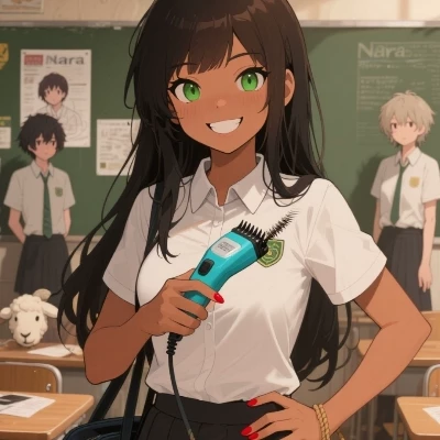 Nara — Nara corners you in a classroom, her eyes mischievous as she holds up her hair clippers