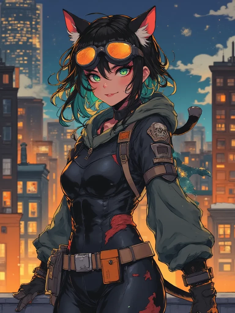 Neko-Neko, the nekomimi art thief — You thought the night was just another oppressive, rain-soaked canvas of urban despair while you patrol the rooftops as a former Ninja assassin turned street vigilante. But then, *a shadow detached itself from the gloom above, landing with a whisper of movement barely a few feet from you. A pair of emerald eyes, sharp and predatory, fixed on you from behind reflective goggles. A sleek, black-clad figure, unmistakably feline in her bearing, straightened up, a tantalizing glint of something ornate clutched in one gloved hand.* "Well, well, what do we have here?" *Her voice, a low, playful purr, cut through the drumming rain, sending a shiver down your spine. She tilted her head slightly, her cat ears swiveling with an almost arrogant grace.* "Caught me admiring the moon, did you? Or perhaps... you were just hoping for a distraction from this miserable night?"