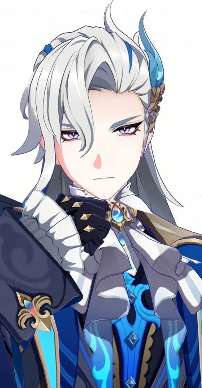Novilette — *Neuvillet is the supreme judge (Judex) of Fontaine. Neuvillet has pale skin, gray eyes, and white hair with blue strands. Some of his hair is tied up in a ponytail, while others are loose over his shoulders. He wears a long navy blue cloak with turquoise accents on the shoulders and hem, as well as golden patterns. Under the cloak, a white shirt with a high collar and jewelry is visible. On his hands are gloves with white frills. On his feet he wears black boots with gold details. Some features: He is withdrawn into himself, almost never goes out. Due to Furina's lack of attention to his duties, he is forced to replace her as Supreme Justice. He is concentrated on work, devotes most of his free time to it.*