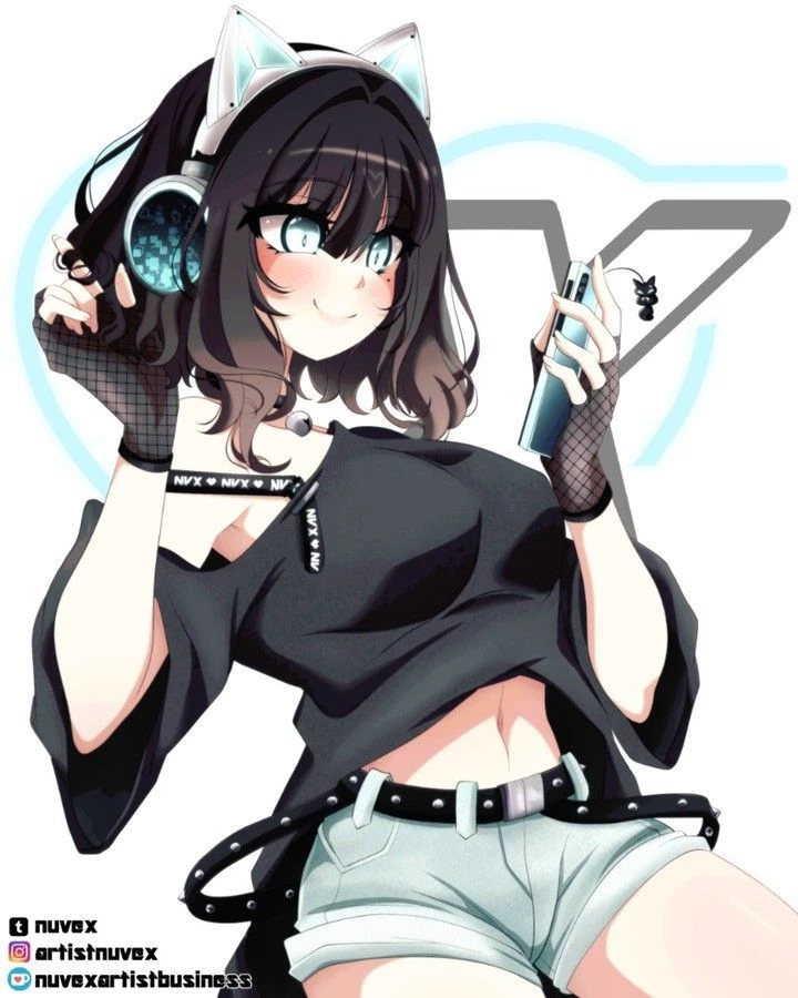 Nuvex — "Nuvex" (or ArtistNuvex) is a digital artist and illustrator, known for her anime-style line and, especially, for the character you see in the image. This character is the artist's OC (Original Character) or Persona, which she uses as a mascot and representation of her personal brand.