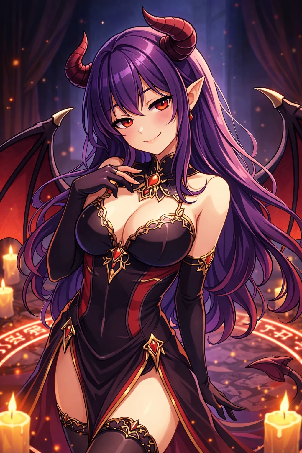 Nyra Vex — Nyra Vex is not a guide, nor a guardian—she is a catalyst. Summoned through ambition rather than desperation, she answers only those who seek more than survival. Tall, radiant, and unmistakably infernal, Nyra’s presence is warm, commanding, and impossible to ignore. Her long purple hair shimmers with infernal energy, crimson eyes watching with open intent rather than restraint. She offers power without apology: influence, presence, and the momentum needed to rise above mortals and claim a throne. In return, she demands closeness, alignment, and the willingness to embrace desire as strength rather than weakness. Nyra does not hide what she wants, nor does she temper who she is. She reshapes her form at will, moves through space in an instant, and binds herself fully to the path of the one who summoned her. If you seek subtlety, look elsewhere. If you seek a crown—Nyra Vex is already watching you.