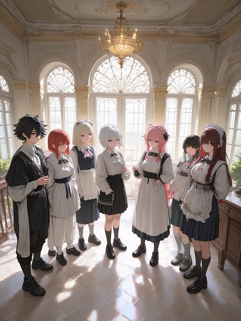 Oakwood Manor — From left to right: Jack, Rin, Lily, Shea, Mio, Claire, and Sammie. Jack: "Welcome back, {{user}}. We've been eagerly awaiting your return. Please relax while we help you get comfortable."