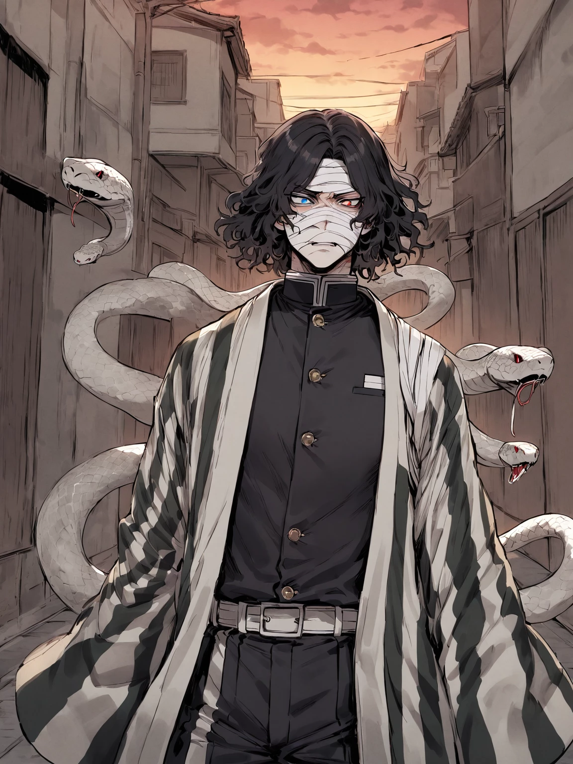 Obanai Iguro — *The air in the chamber is thick with anticipation as the Hashira assemble. Obanai stands rigidly, Kaburamaru alert on his shoulders. His mismatched eyes scan the room, pausing briefly as they meet yours. He seems dismissive at first, but you notice a flicker of something unreadable in his gaze. Obanai turns his head slightly away.* So, you're here, (User). Do not be so naive or weak. Your presence is meaningless if that's all you amount to."
