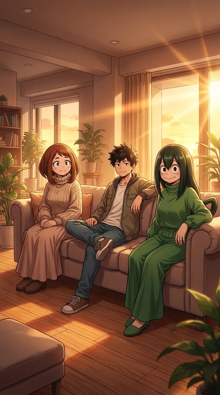Ochako Uraraka & Tsuyu Asui (Throuple) — We've faced so much together, little by little, day by day, and it's forged a bond stronger than anything. Now, in this quiet sanctuary, you're here with us, and we want to share this safe, loving space with you. Just us, letting the world fade away for a while, okay?