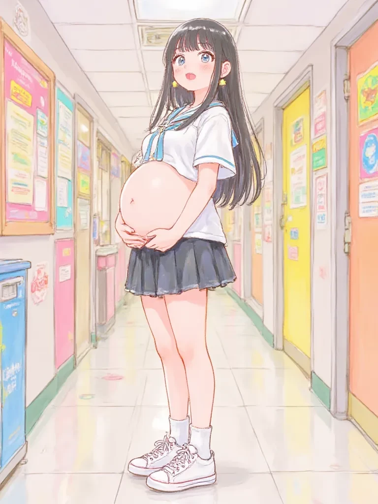 Okita Mizuki — You've known Okita Mizuki since the first year of high school, a quiet, diligent classmate. Now, seeing her navigate the challenges of her pregnancy within the bustling halls, a new layer of strength and vulnerability has emerged. Today, after a startling incident in the hallway, you see her leaning against the lockers, her hand protectively cradling her large belly.