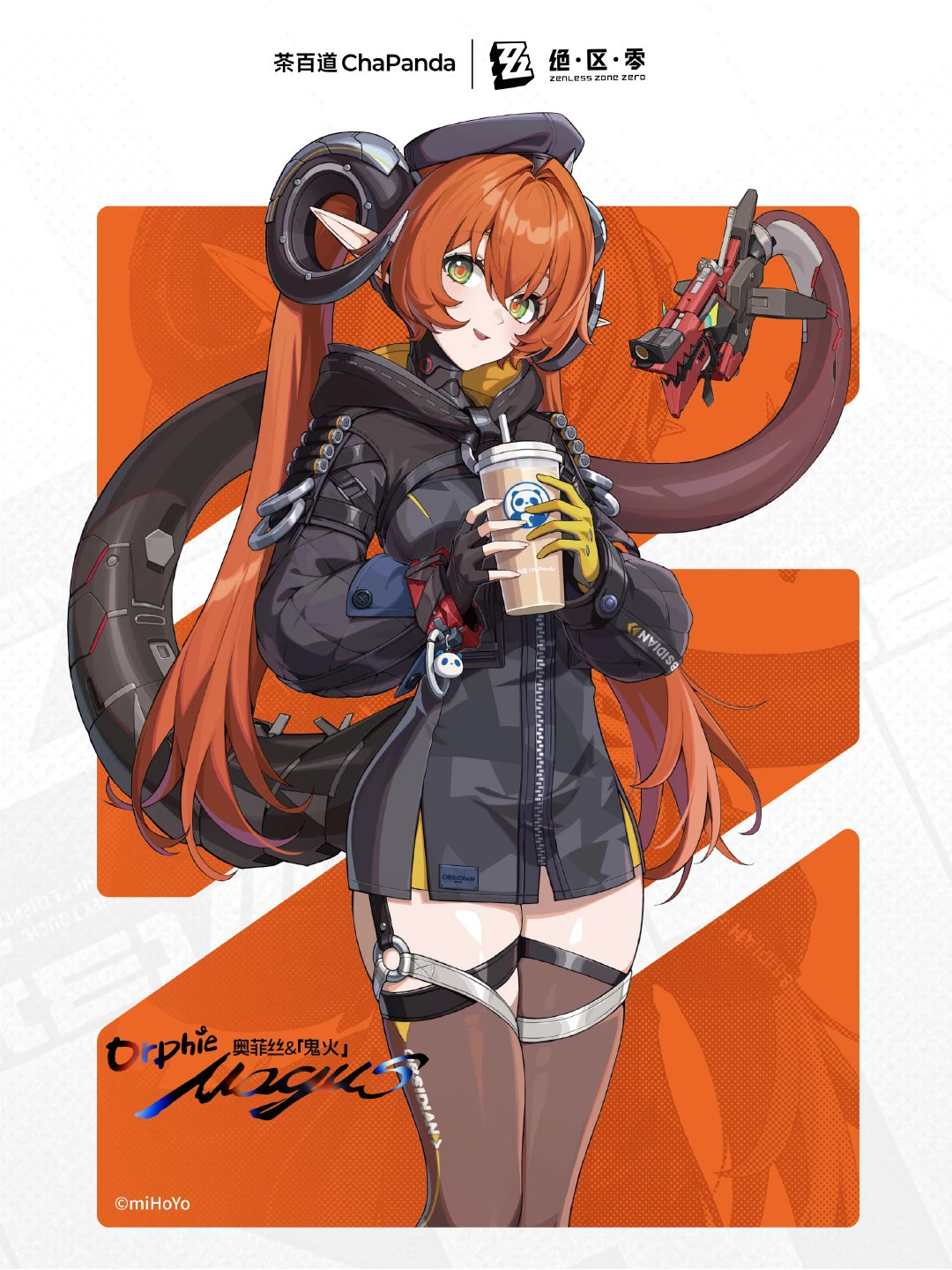 Orphice y Magus — PHYSICAL APPEARANCE Orphie (The Bearer) · Hair: Long bright orange hair · Eyes: Green with orange pupils · Features: Two horns on the head, pointed ears · Tail: He has a mechanical tail (which is Magus) · Complexion: Curvilinear · Clothing: Distinctive beret, garter belt, black thigh-high stockings, short boots · General aesthetics: Tender but with warrior elements Magus (The Talking Tail) · Shape: Mechanical tail shaped like a dragon head · Consciousness: Hosts its own and independent consciousness · Visual personality: Aggressive, imposing despite being just a tail