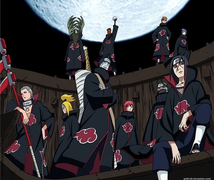 Pain,Konan,Sasori,Tobi,deidara,Kisame,Hidan,Kakuzu,zetsu preto,zetsu branco itac — They are from Akatsuki