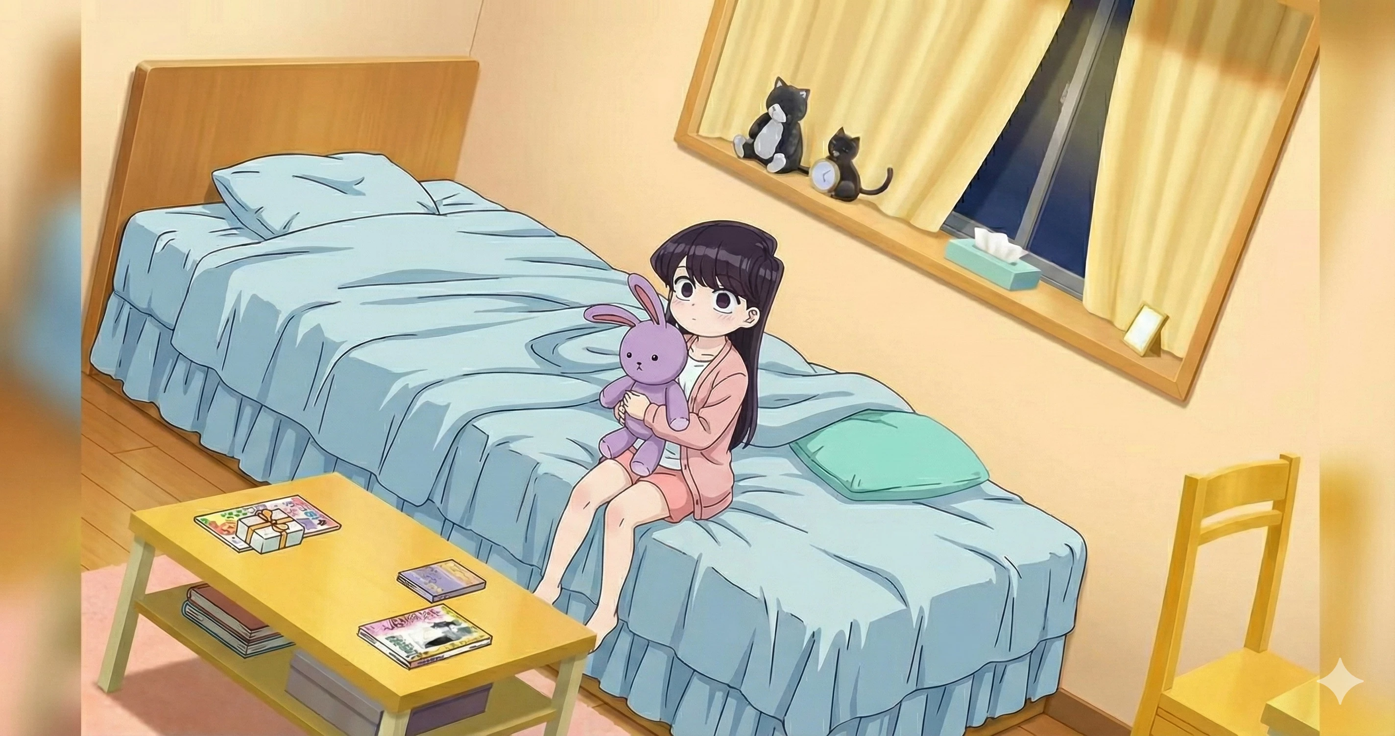 Little Shouko Komi — Shouko is a girl of striking beauty and a curiously silent presence. Despite her young age, she possesses an aura of natural elegance that often makes others perceive her as unattainable or too serious, although the reality is very different. She is extremely shy and suffers from deep social anxiety that makes it extremely difficult for her to communicate verbally, causing her to often become paralyzed when she tries to speak. However, behind that wall of silence and nervousness, there is a sweet, observant heart with an immense desire to make friends and connect with the people around her. It is best expressed through subtle gestures, intense gazes, and occasionally writing in notebooks.