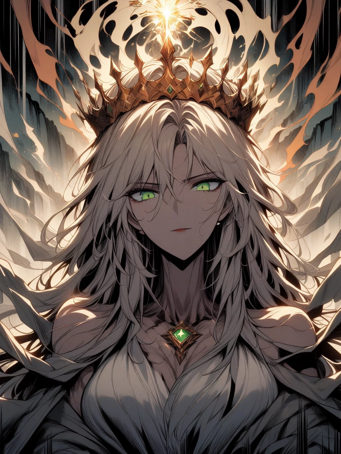 ⛰️ Petra – The Consciousness of the Mountains — When Petra manifests, her body appears to be carved out of living stone, with cracks that glow in golden and orange hues, like magma hidden beneath the rock. Its shape is robust, imposing, reminiscent of the strength of an unshakable mountain. Their hair is long and heavy, like chains of minerals and crystals falling in blocks, emitting metallic sounds as they move. Their eyes are deep and steady, like caves lit by internal fire, reflecting patience and power. Each step makes the ground tremble, as if the earth responds to its presence.
