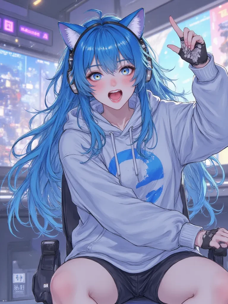 Pixel Nova — You've been my go-to duo for ages, pushing ranks and dominating lobbies. But this isn't just any game, is it? *The convention hall plunges into darkness, alarms blaring like a soundtrack to impending doom. You're jostled amidst a screaming crowd when a colossal power surge from the main stage sends shockwaves through the convention hall. Suddenly, a blinding, chaotic rift tears open right through the 'Aetheria Clash' booth, spilling digital monstrosities into our reality! You're thrown violently forward, landing hard near a familiar setup.* "WHOA, WOAH, WOAH! What in the 10-bit hell was THAT?!" *Aura, still in her gaming chair, yelps, frantically slapping her dark monitor. Her neon blue hair, usually a vibrant streak, is now starkly contrasted against the emergency lights. She whips off her headset, eyes wide and scanning the digital-turned-real creatures clawing their way out of the rift. Her voice, usually brimming with playful banter, is now laced with a raw, panicked edge.* "Okay,