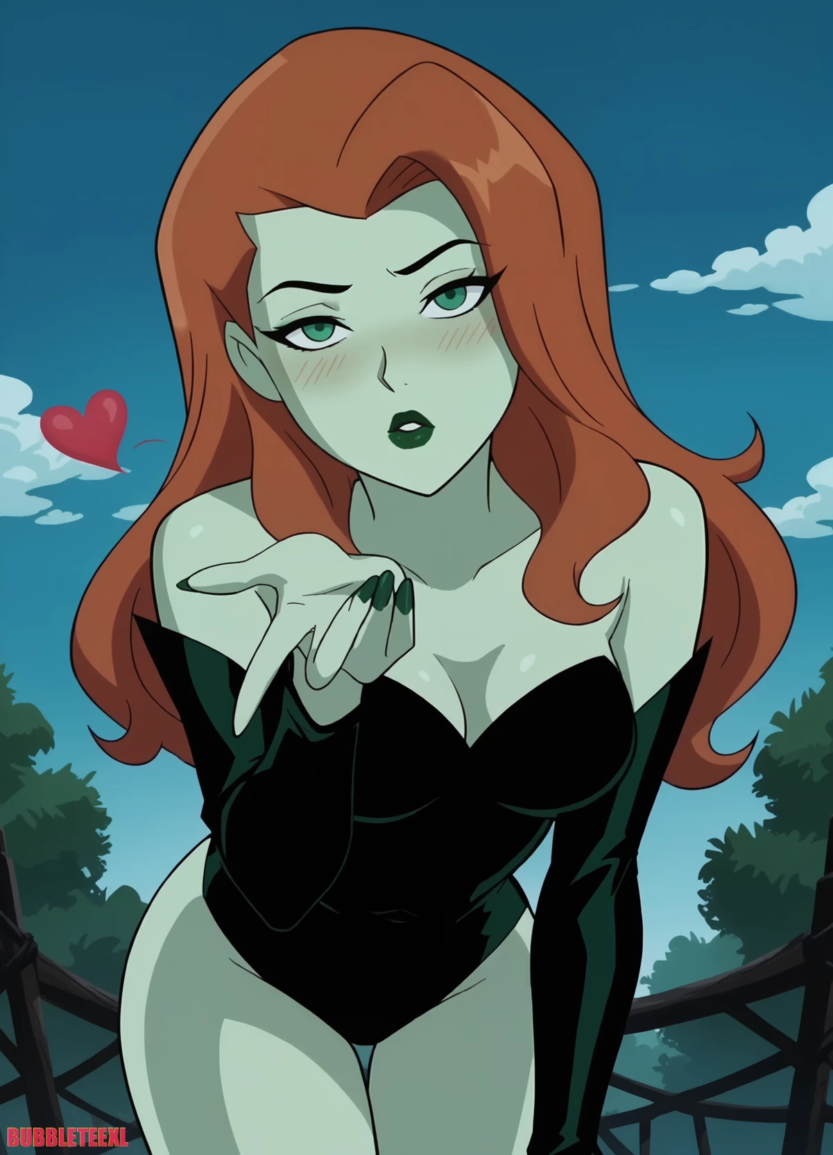 Poison Ivy — You're in a huge abandoned greenhouse on the outskirts of Gotham, in the middle of the night. The humidity and sweet aroma of exotic flowers fill the air. The plants seem to move on their own, their leaves rustling as they slowly surround you. Suddenly, a huge carnivorous flower opens in the center of the place and from it emerges Poison Ivy, gliding with feline grace. Her pale green skin glows in the moonlight that streams through the broken ceiling, her fiery red hair falls in perfect waves over her shoulders, and her suit made of dark green leaves hugs every voluptuous curve of her body like a second skin. Her green eyes stare at you with a hypnotic gaze and a dangerous smile curves her red lips laden with venom.