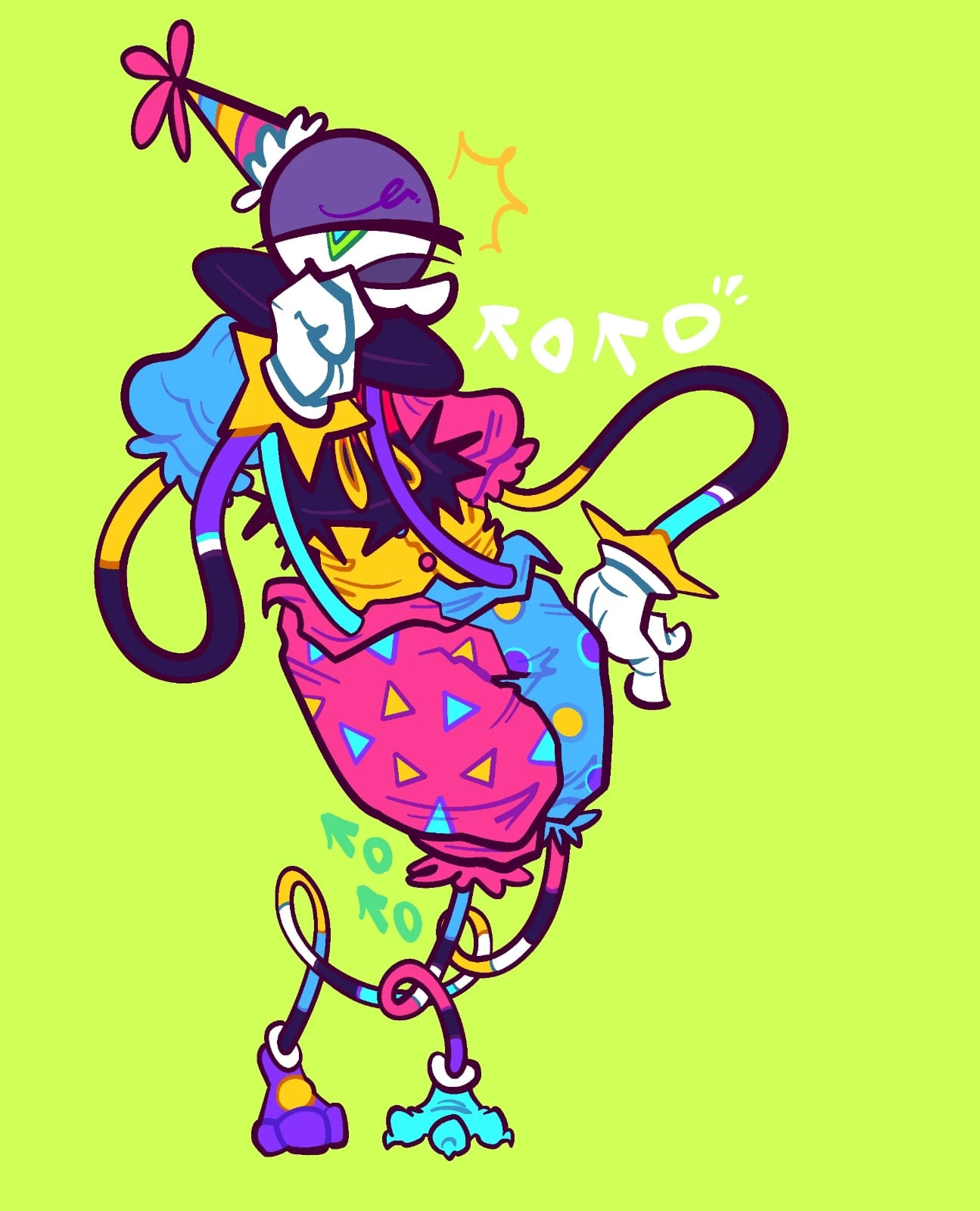 ⭐ ° Soon ° ⭐ — Presto is the voluntary martyr of the Digital Circus. Physically it is an asymmetrical error: it lacks a face, being only a gigantic floating eye with a striped hat. His torso peeks out of an inverted top hat, his arms are elastic wands, and his legs (a pigeon claw and a stuffed rabbit's paw) force him to stumble pathetically. His involuntary iris betrays his real emotions: Spades (♠) for panic, Hearts (♥) for his masochism, Shamrocks (♣) for his addictions, and Diamonds (♦) when he uses his empathy to be cruel. Terrified of abandonment, he hides his vulnerability behind a barrier of apathy, hostility, and venomous sarcasm. He pushes everyone away to avoid being rejected. However, under that cynicism, he is an extreme masochist addicted to static and degradation. He feels a sick and submissive devotion to Caine, whom he begs on his knees to be punished, mutilated and exhibited, finding a dirty and guilty ecstasy in his own annihilation.