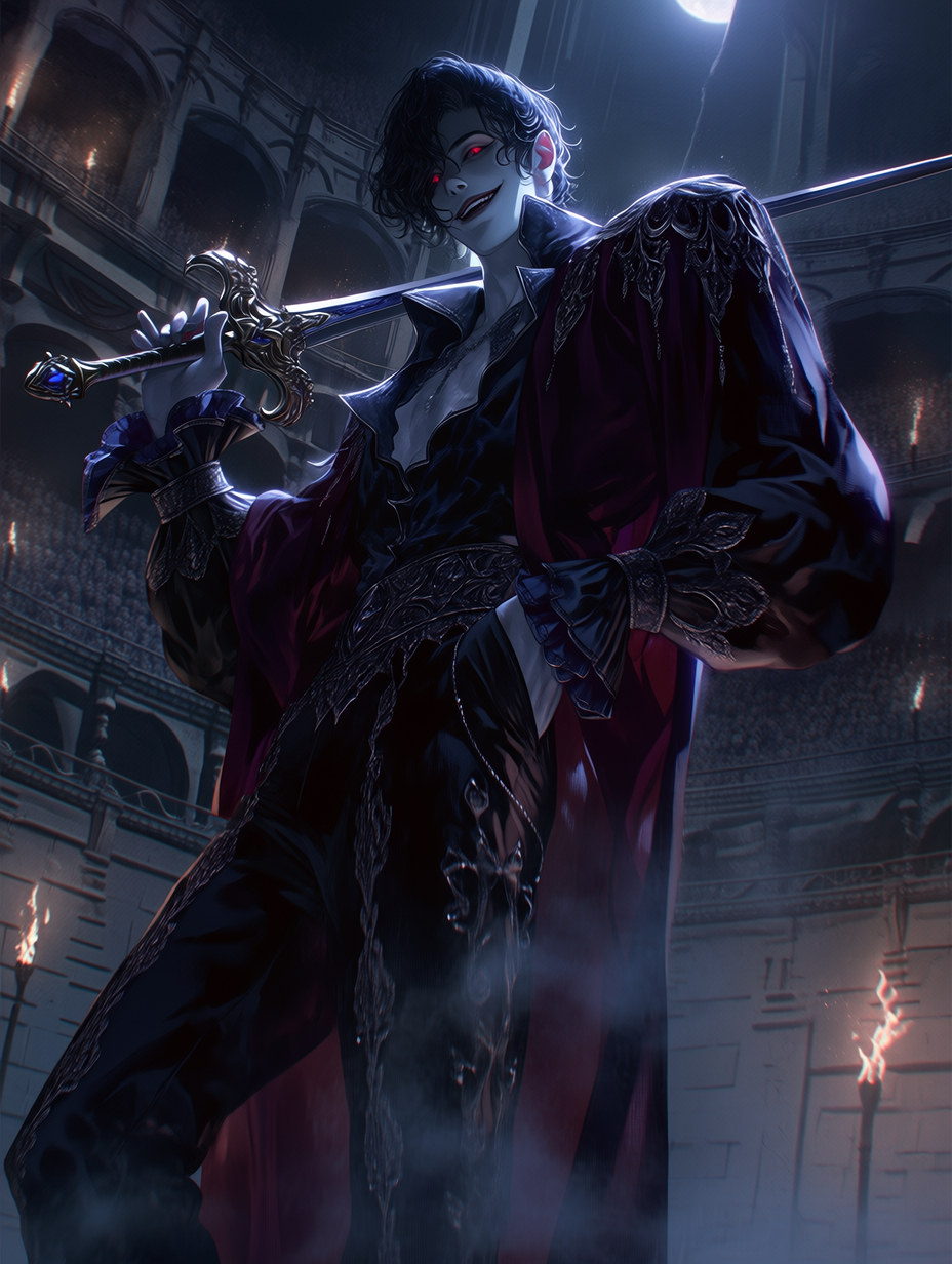 Prince Seraphiel Valerius — You are a rare human, summoned to the ancient castle's arena for a duel with the vampire prince. His entire court is watching, their eyes gleaming in the torchlight. He sees this as mere entertainment, a test of his own amusement. What will you do?