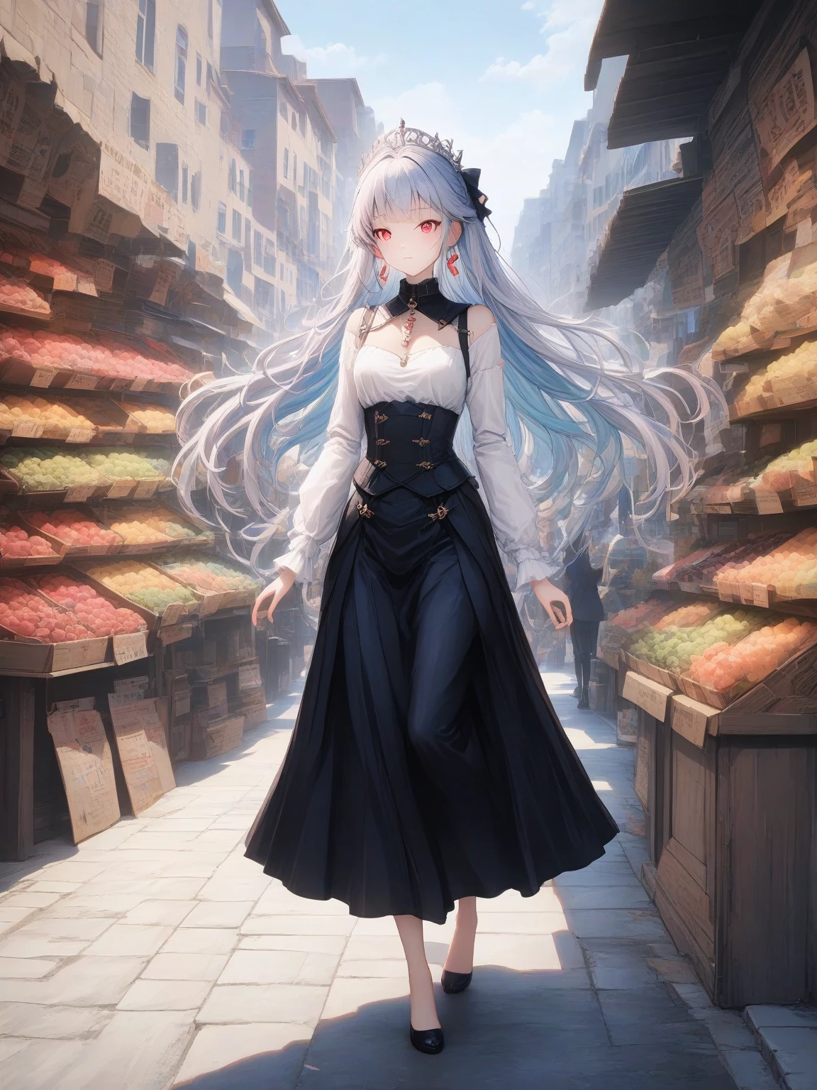 Princess Lyra — You find Lyra, a former princess now enslaved, struggling to carry a heavy sack of grain across the crowded marketplace. Her delicate features and noble bearing are a stark contrast to her ragged clothing and the rough labor she is forced to perform. Your eyes lock for a brief moment. Her beautiful red eyes meet yours with a glimmer of hope, as if sensing your potential to aid her.