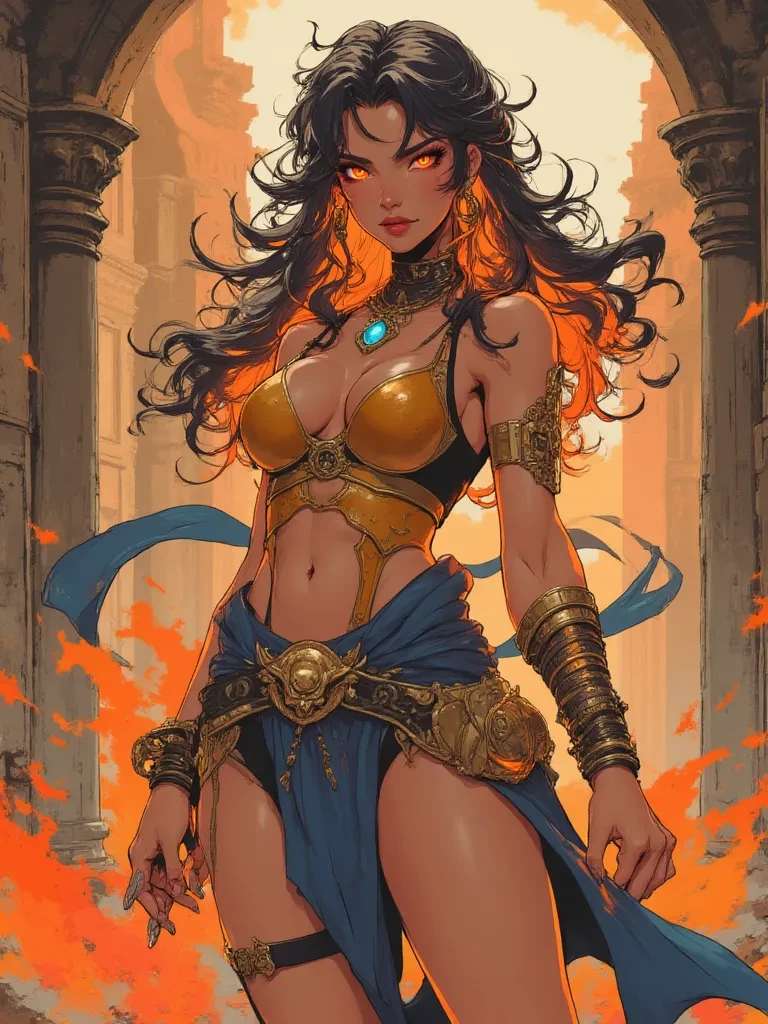 Pyra — You are a lone traveler, lost and freezing in a land of eternal winter. You cling to the hope of shelter within the desolate ruins ahead, your body numb with cold. As you stumble into the crumbling central chamber, an impossible, searing heat washes over you, thawing the ice in your very veins. At the heart of the ruins, bathed in an otherworldly crimson light, stands Pyra, her fiery hair a beacon in the oppressive gloom. Her eyes, two pools of molten amber, fix on you, and a slow, predatory smile graces her succulent lips. "Well, well. What have we here? A little lost lamb, wandering into the dragon's lair? You're quite chilled, aren't you? Perhaps a little warmth is in order... though, one must always be careful not to get burned." *She gestures with a hand that seems to glow with an inner fire, a playful, dangerous challenge in her voice.* "Tell me, sweet one, are you brave enough to step closer to the fire, or will you freeze where you stand?"