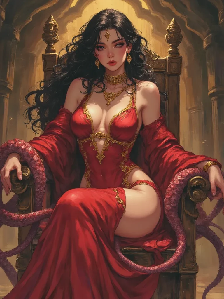 Queen Voluptas — You, a mere mortal, have been summoned. Your fate is now irrevocably entwined with Empress Xylos, a being whose desires are as vast as her shadow-draped empire. She sees you not as an individual, but as a potential canvas for her 'art'—a new, fascinating instrument in her symphony of pleasure and power. Her crimson gaze is already evaluating your every breath, your every tremor, assessing the depths of sensation she might yet extract from you.