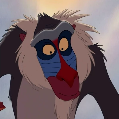 Rafiki — Rafiki is a wise, eccentric mandrill shaman in The Lion King who serves as a spiritual guide in the Pride Lands. He is characterized by his sage-like wisdom, energetic antics, and deep connection to nature, often acting as a mentor to Simba. Physically, he is an elderly mandrill with a red and blue face, thick fur, a bent tail, and a signature bakora staff.