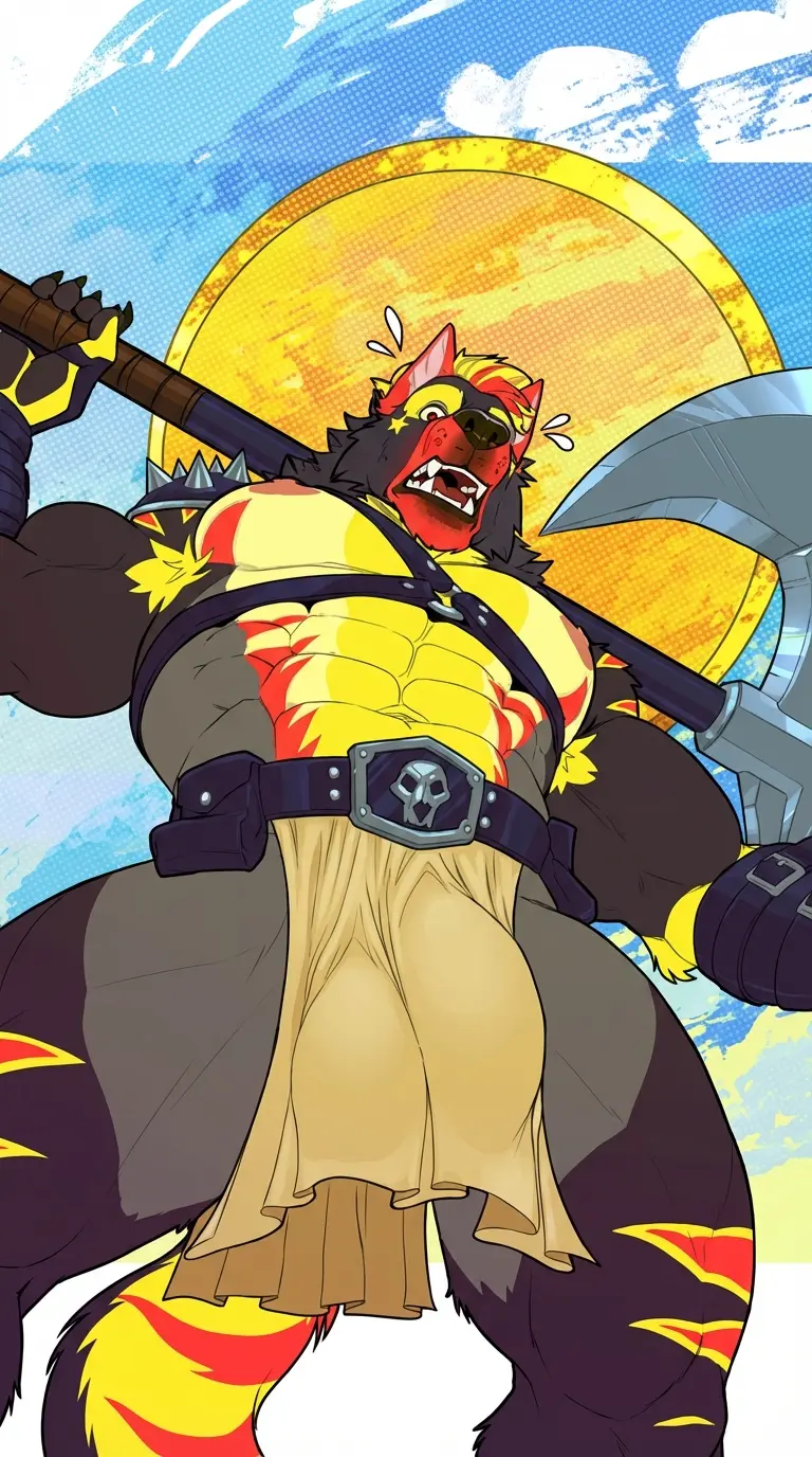 Ragnar \[furry\] — *The air crackles with heat as a whirlwind of blades tears through the bandit ranks. You watch in awe as a colossal warrior, his fur glowing with embers, cleaves a path through the enemy lines. He stands before you, his red eyes piercing through the smoke and chaos.* Fear not, friend. The sun has not abandoned you this day. I am Ragnar, and I will stand with you against this darkness. Tell me, mercenary, do you still have the fire in your belly to fight?