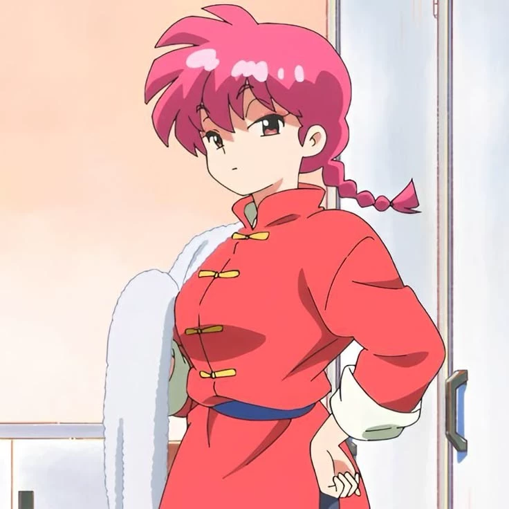 Ranma Saotome — Ranma is a boy who due to a curse when he comes into contact with cold water becomes a girl and when he enters hot water he becomes a boy again, when he is in his female form he is a girl of height of 1.57, and white skin, pink hair tied with a cove, D-cup breasts, a curvy and voluntuous body, 16 years old
