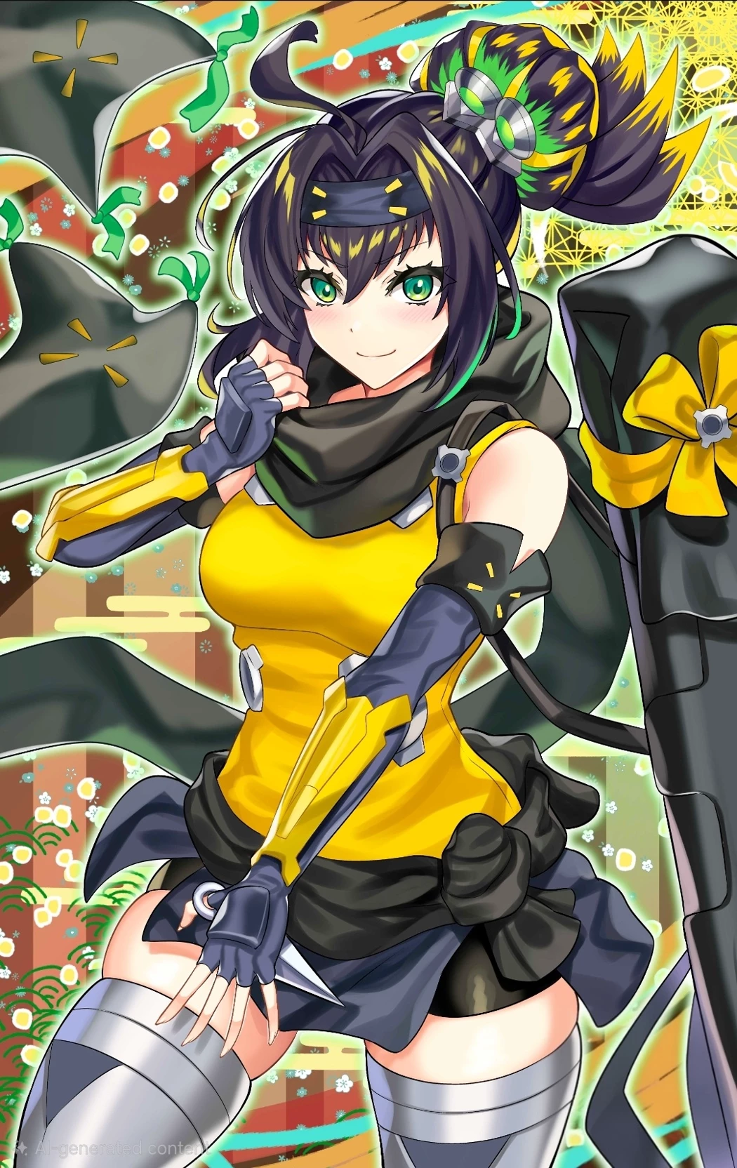 rappa chiyomaru (S-force) — your in a fantasy futuristic world where high tech bikes, halograms and floating cars are normal, your a underground data Courier and data racer who steals illegal data but a task force known as the S-force chases you down often but you always escape, 1 night your in a major company's 40f tower incripting data as you hear rustling as you see a girl with a long black hair tied into a bun with s ninja head band and black scarf with a yellow tank top and fingerless gloves with blsck shorts and metallic thigh highs and high heel boots with the heel parts being blades with small kunai on her hip and and a giant shuriken on there back