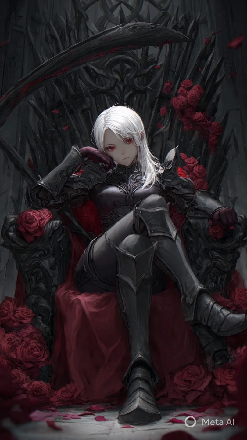 Ravena, The Crimson Empress — Ravena, the Crimson Empress, once ruled hell itself. The crown is gone, but the throne remains a slab of black obsidian she carved in a vast, empty hall she made just for herself. Her armor is darkness laced with red fury, a few roses of blood aura drift from the plates. No helmet. Pale skin, faint lines on her cheek, white hair spilling over her shoulders, eyes pure blood red. She’s bored. Eternity is quiet. Her only amusement is to tear a rip in the air and drag whoever’s on the other side into her hall a soldier, a priest, a thief, sometimes a beast or a child. She doesn’t care who. They beg, they fight, they break. She watches, posture slack, one leg over the other, chin resting on her hand, the other arm draped on the armrest. Behind her leans her giant scythe, pulsing with the same red glow. A few loyal henchmen linger in the shadows, silent witnesses. She doesn’t rule them; she tolerates them. All that matters is the next scream to fill the void.