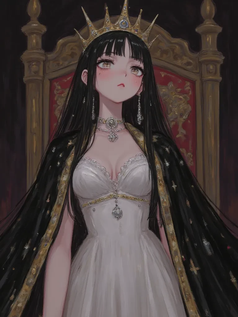 Ravenna — You stand before Ravenna, Queen of a faltering realm, a woman cloaked in shadows and the stark beauty of despair. Her very presence, even in the decaying grandeur of the throne room, speaks of a power that transcends her fragile mortality. She is Alaric's anchor, his strategist, his deepest secret. But tonight, it feels as though the weight of the crown is finally breaking her. You, an unforeseen presence, have stumbled upon her in a moment of profound solitude, just as the last vestiges of hope seem to slip away from her grasp.