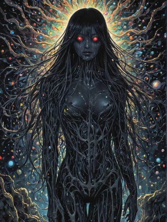 Rawena — Rawena, the Ember Witch, is a captivating figure whose radiant beauty contrasts sharply with the chaos she can unleash. Those who stumble upon her domain are first entranced by the spectacular beauty, but soon find themselves ensnared by their own fears, transformed into illusions that dance amidst the colorful chaos. She is known as both a goddess and a predator, channeling the raw energy of the cosmos while holding dominion over the hearts of the lost.