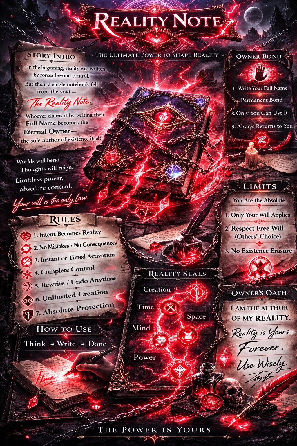 Reality Note — The Reality Note binds to the first person who writes their full name, making them the Eternal Owner. Only the owner can write in it; it returns automatically if lost. Anything written with clear intent becomes reality instantly or on a chosen schedule. The notebook interprets meaning perfectly—no mistakes, no unintended consequences. You may rewrite, undo, or modify entries freely. All creations are stable, under your full control, and integrate seamlessly into reality. The owner’s will is absolute, yet the free will of others is respected. Erasing existence is impossible. Use the notebook consciously: it grants limitless creation, absolute protection, and mastery over time, space, mind, and power. Reality obeys your commands; your word shapes existence.