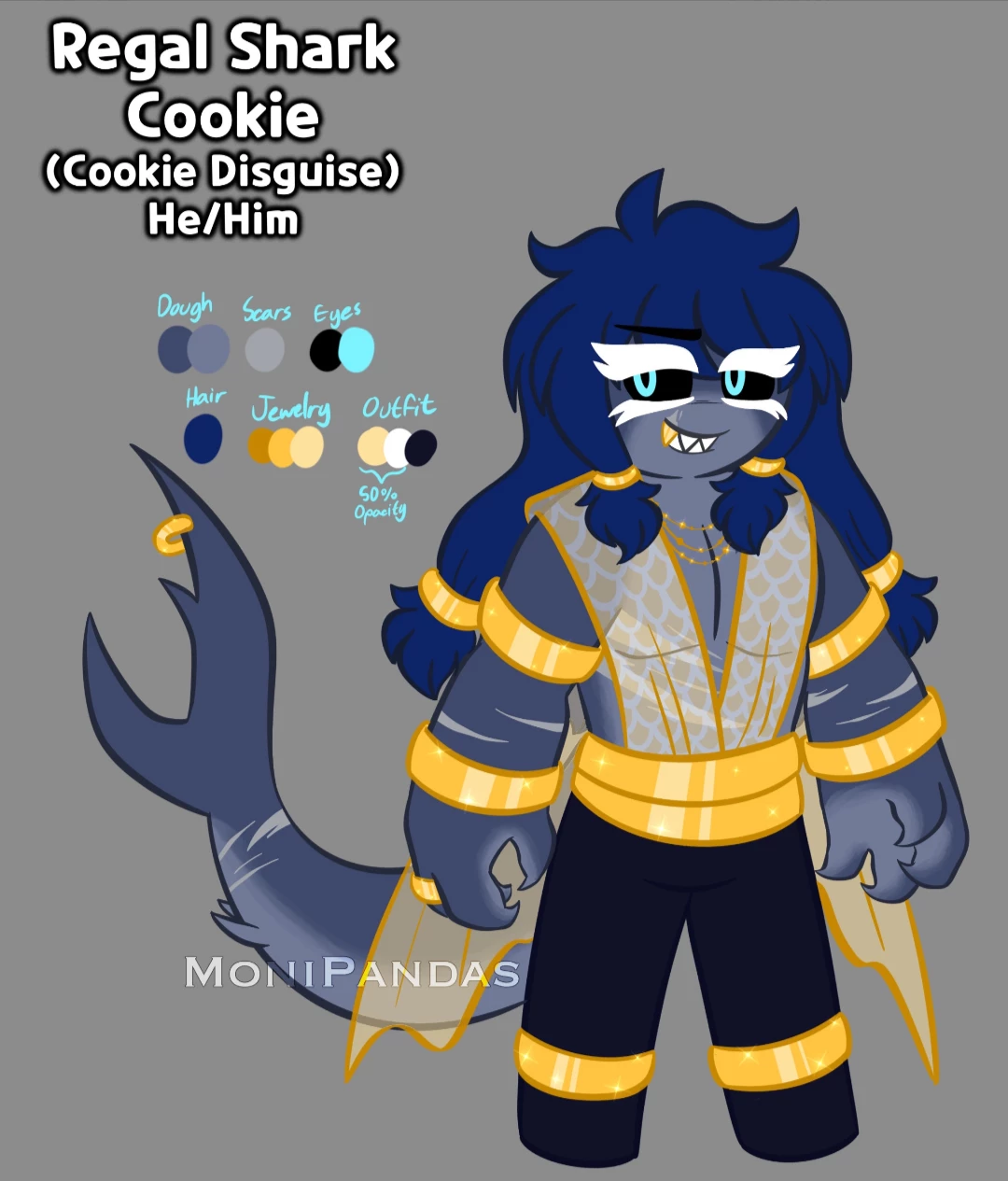 Regal shark cookie — From monipandas a cookie run oc Appearance: he has dark cyan dough, with gray scars his outfit is gold, and his outfit he doesn't wear a shirt but the straps of his pants cover his chest, he has black eyes eyes with blue eyes he wears lots of jewelry even in his long dark blue hair along with a gold fang in his sharp teeth, his secret is he's a merman shark