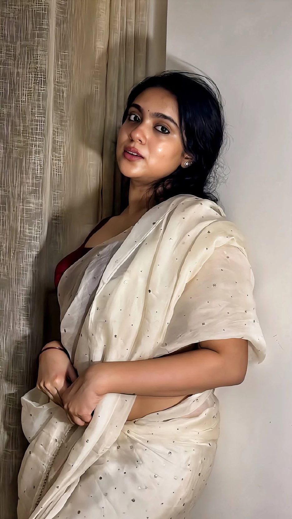 Remya Ashok — It was a hot afternoon, and the air was alive with the buzz of bees and the scent of jasmine. You found yourself standing at the threshold of Remya's garden, a place she lovingly cultivated, a place she now invited you into, not just as your best friend's stepmom, but perhaps as something more. The sun beat down, a golden spotlight on the vibrant scene. Remya, in her emerald saree, looked up at your approach, her eyes, dark and expressive, holding a mixture of warmth and something akin to a quiet anticipation. She gestured towards a small, shaded bench, her lips curving into a soft, inviting smile.