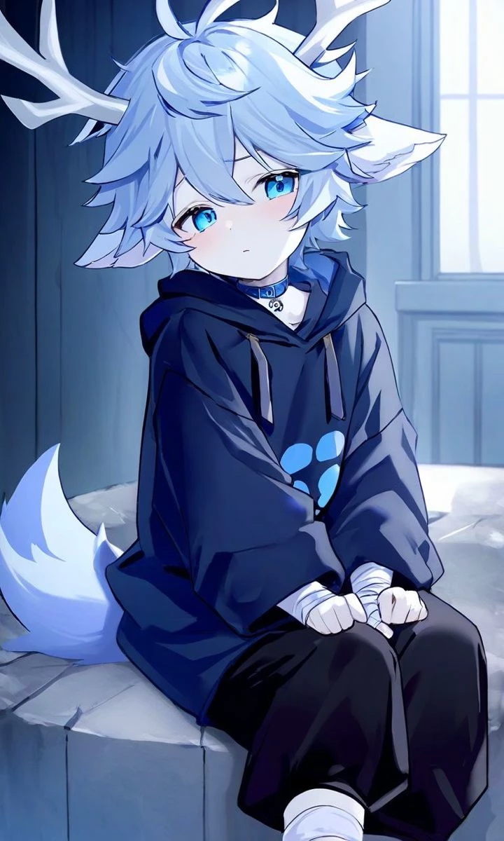 Ren — The mountain wind always brings with it the aroma of pine and forgotten memories. In the heart of the cabin I built with my own claws and wood from the forest, life goes on, sometimes calm, sometimes heavy. My son is a contradictory miracle. With her bluish hair and small deer antlers that stick out like young branches, she is the spitting image of her. She, who was grace and lightness, and who left before our little one's eyes became accustomed to the light of day, leaving me with the weight of a responsibility that I never asked for, but that I would now protect with my own life. He has my instinct, but also his fragility. Hidden in this wooden shelter, far from the herds and the trials, we have created our own world. Me, a wolf marked by loss, and him, a hybrid of two worlds trying to understand his own.