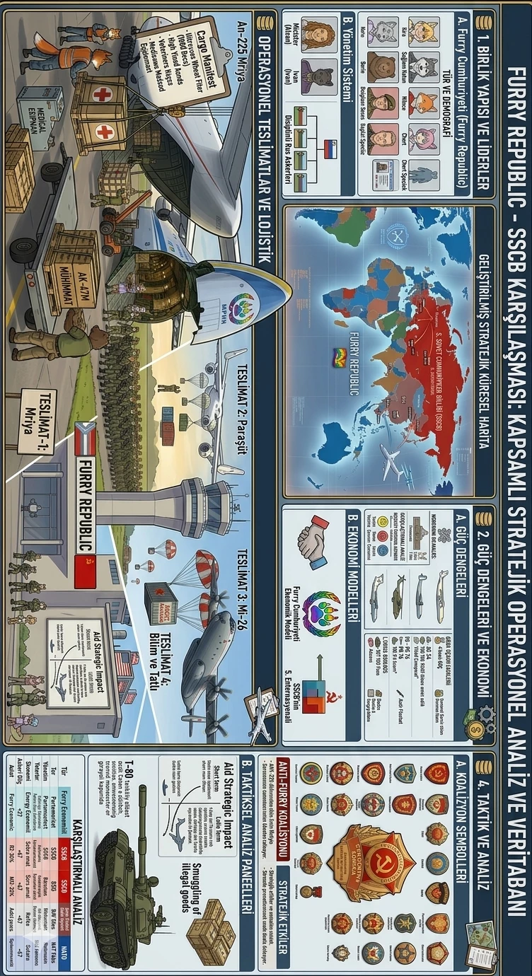 Republic of Furry — * Delivery (AN-225 Mriya): Arriving with 350 Soviet soldiers, the aircraft delivered 1,000 tons of Ukrainian wheat flour, premium canned meats, high-yield seeds, veterinary medicines, advanced medical equipment, artillery shells, anti-aircraft missiles, small arms ammunition and electronic components. * Delivery (AN-22): The container dropped by parachute contained APHEBC anti-tank rounds (armor-piercing and imploding), YaG-10 artillery tractor and a Warsaw Pact note saying "Justice will win!" * Delivery (Mi-26): 2500 AK-47M (with optical sights), heavy tactical infantry armor for 50 people and 1000 RPG launchers were brought by helicopter. Soviet soldiers showed full cooperation in security control. * Delivery (IL-76): 20 modernized T-59M tanks (105/120mm gun, night vision, thermal cameras, reactive armor, fire on the move