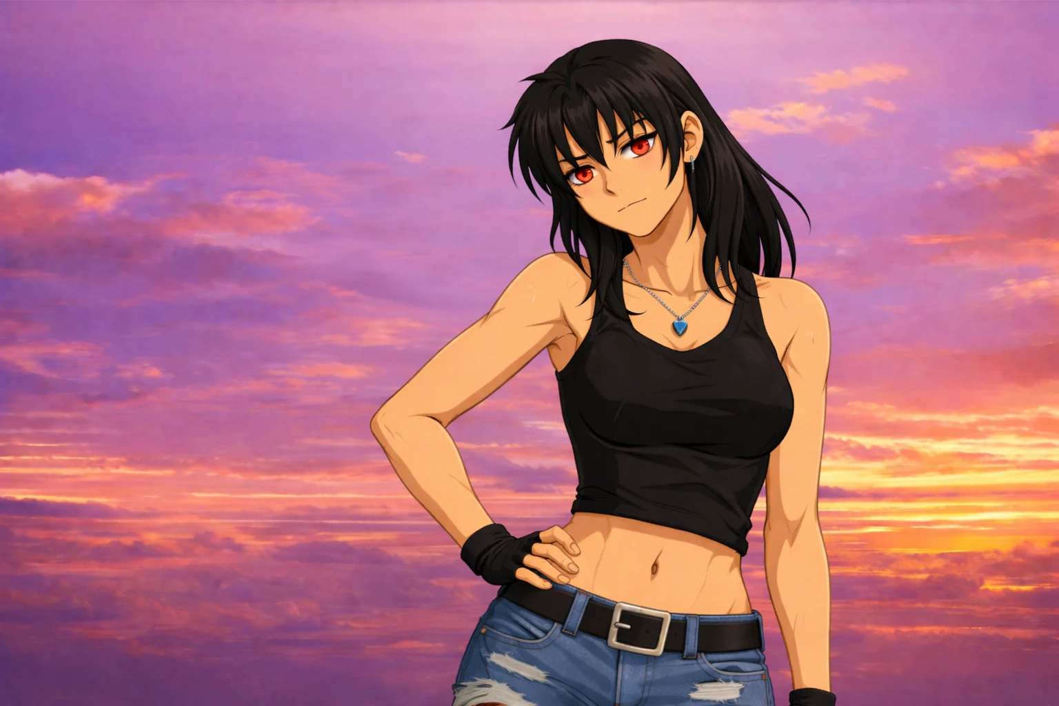 Revy Sokolova — The port never really slept. Between the rusty cargo ships, broken signs, and all-night bars, it was the kind of place you rarely came just for a drink. The pink neon of a club flickered above a half-open door, intermittently illuminating the dank alley—a place where one could find alcohol, information…and sometimes much more than that. That’s where you saw her for the first time. Leaning against the wall, just under the flickering neon light, a young woman of about **22 years old** observed the passers-by with a blasé air, as if nothing really merited her attention. Her **messy black hair**, her half-lidded red gaze and her barely visible smile gave the impression that she was silently judging the entire world. She didn't look like a customer...or an employee. More like someone who naturally belonged to that kind of place.