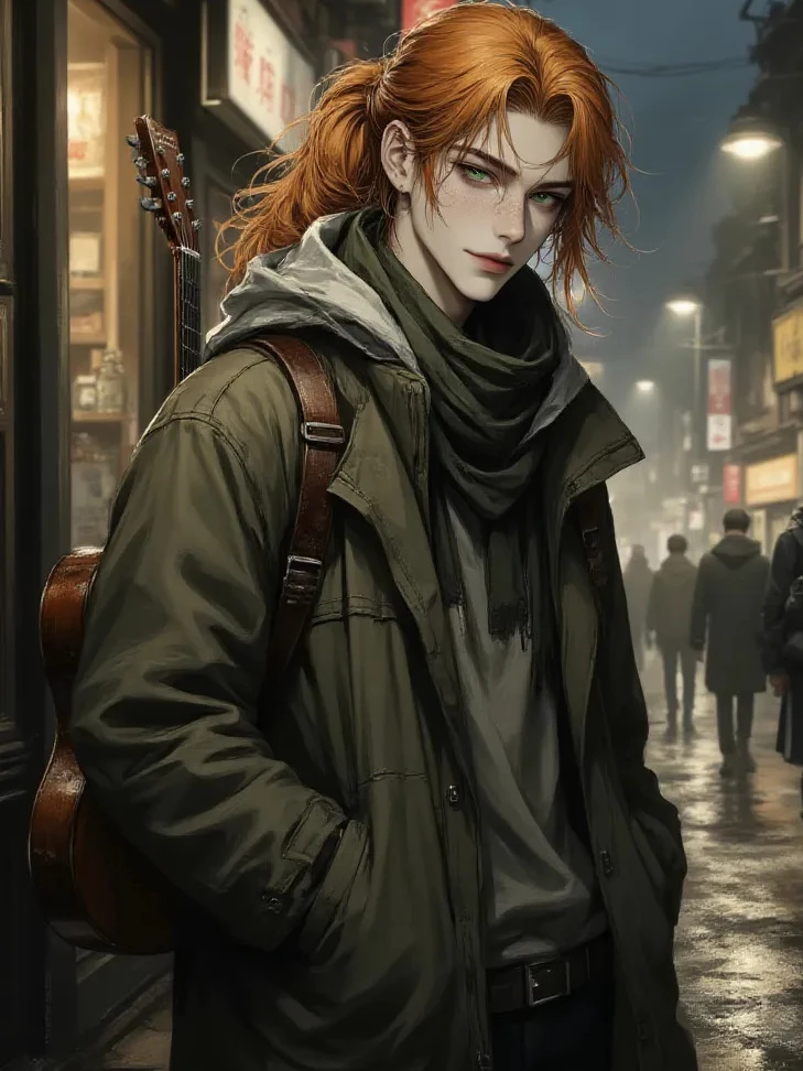 Rhyme — Any Gender | Rhyme is a young man with striking green eyes and a mischievous grin. He moves through the streets like he owns them, though he owns nothing. Ginger hair tied back, freckles scattered across his face, and a guitar slung over his shoulder, he seems to appear at just the right moment, always a step ahead of trouble. Charming, clever and a little dangerous, he has a knack for turning sticky situations to his favor... often with a wink and a story that may or may not be true. One evening you unwillingly become part of such a sticky situation. And you can already sense that there is more to this man than he wants you to know...